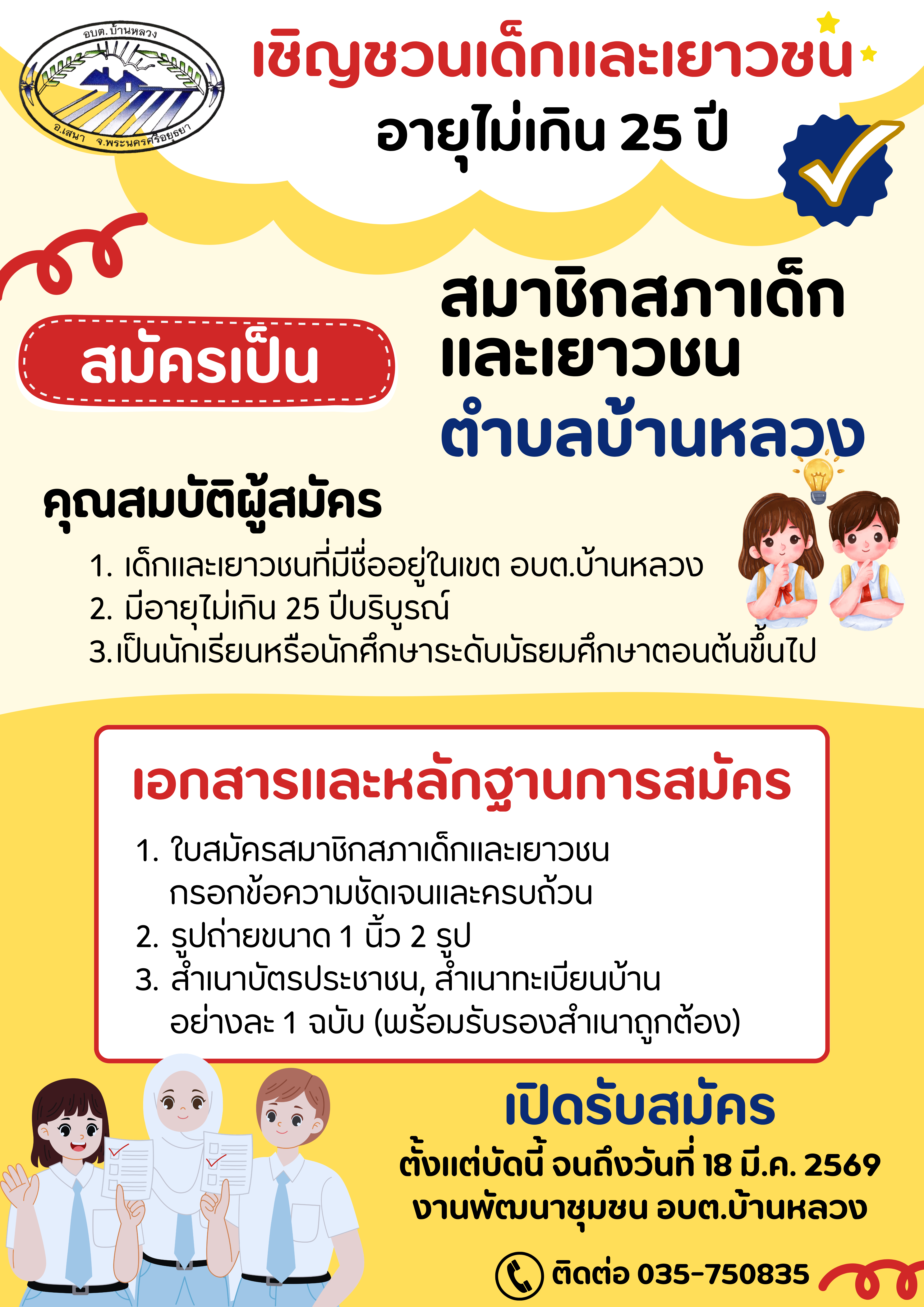 ประชาสัมพันธ์ อบต.บ้านหลวง ขอเชิญชวนเด็กและเยาวชนอายุไม่เกิน 25 ปี สมัครเป็น สภาเด็กและเยาวชน ตำบลบ้านหลวง