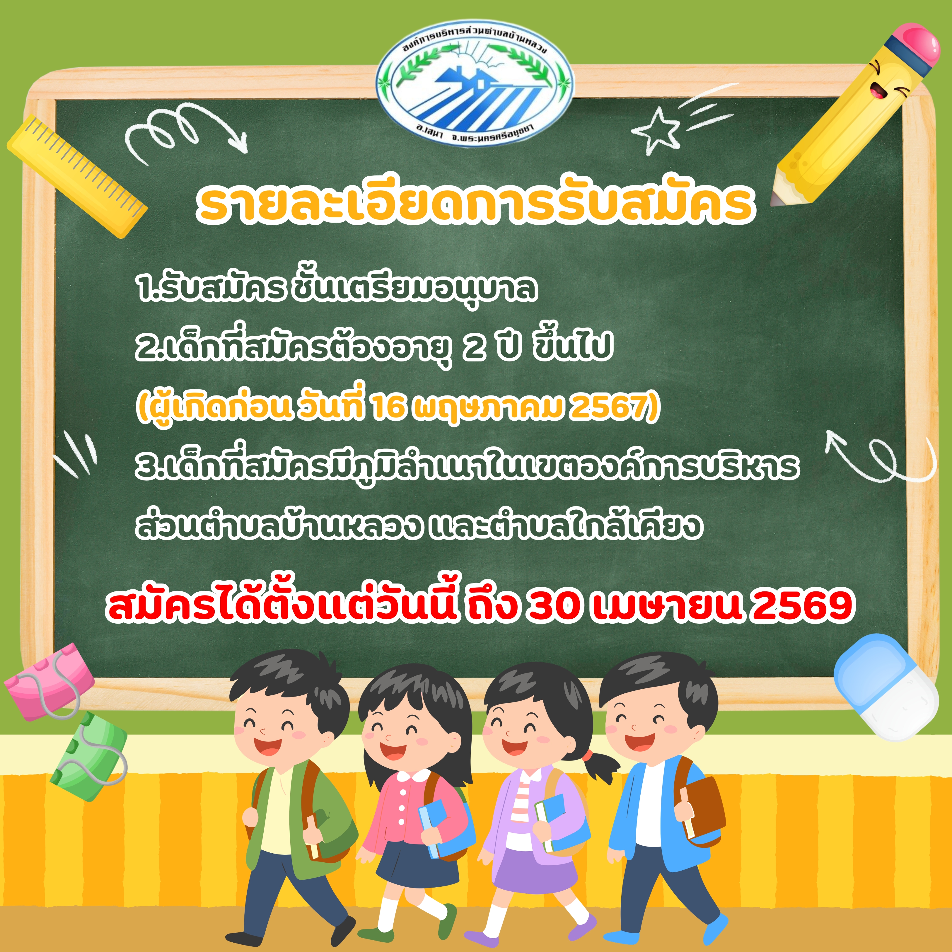 ผู้ปกครองที่สนใจสามารถติดต่อสมัครได้ตามวันและเวลาราชการ |